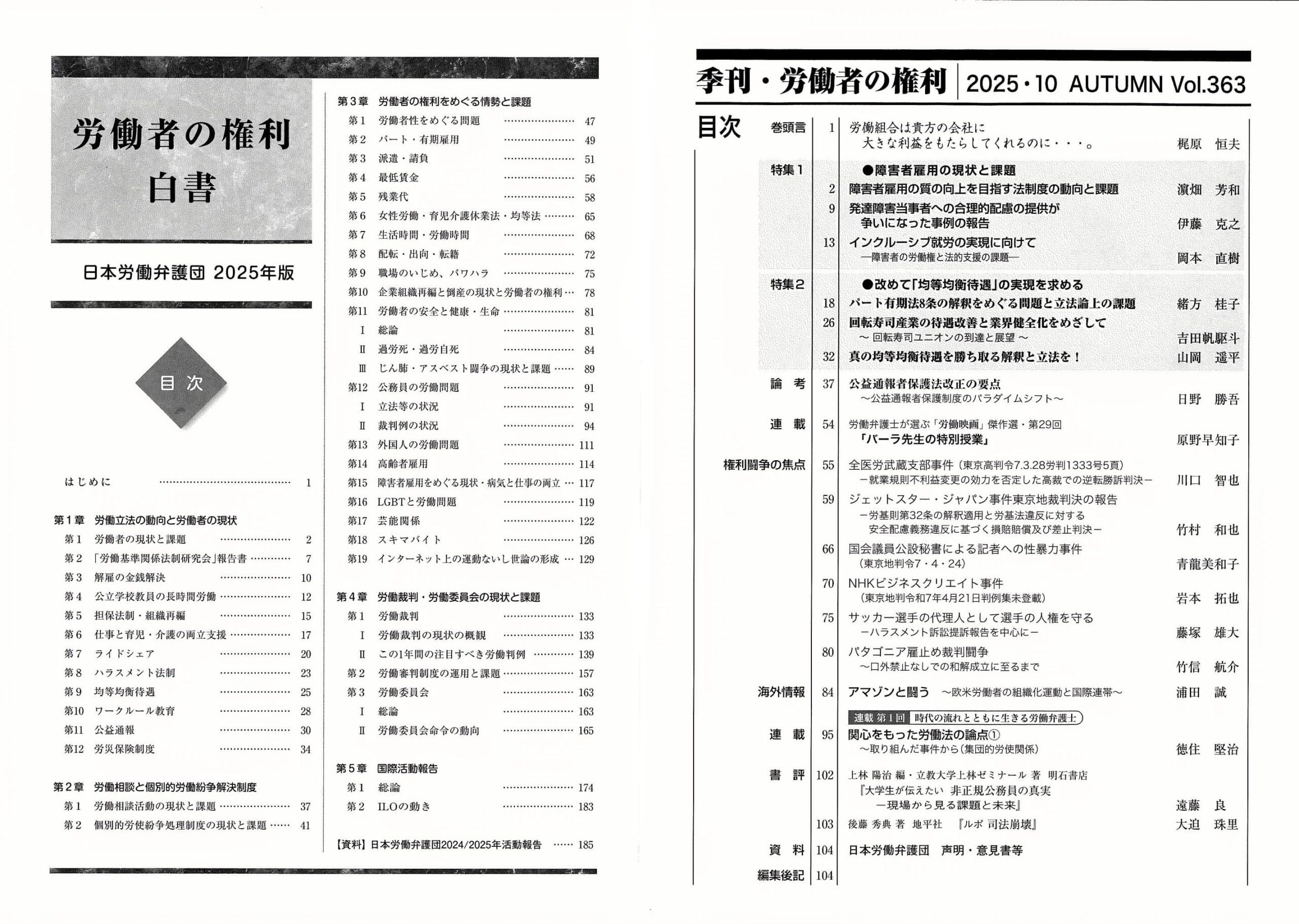 「季刊・労働者の権利」362号(2025年労働者の権利白書/192頁)と、363号(2025年秋号/104頁)の発行をお知らせいたします。